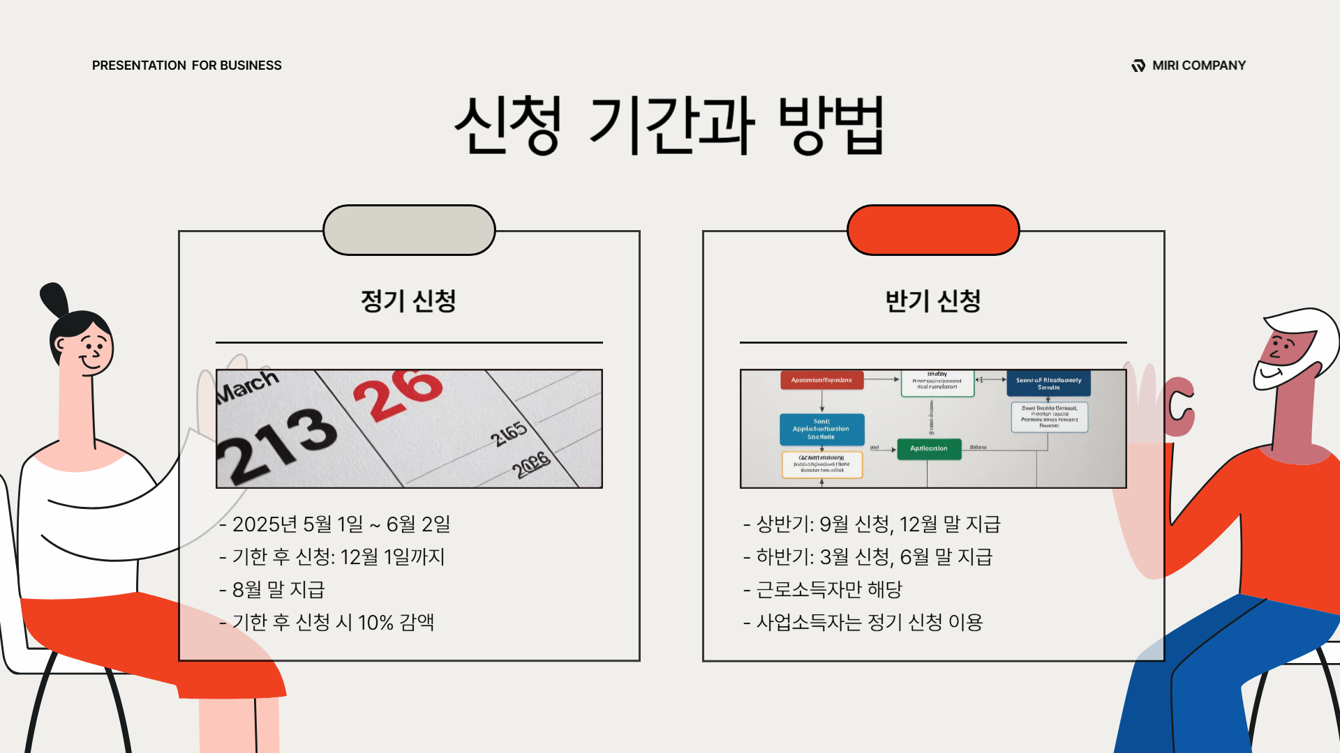 - 반기 신청: 상반기 9월 신청(12월 말 지급), 하반기 3월 신청(6월 말 지급)