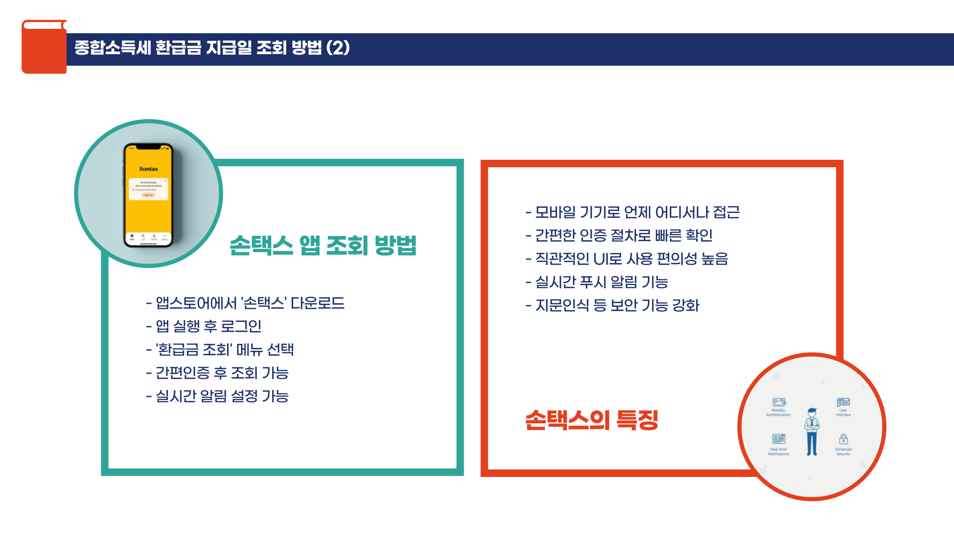 | 손택스 | 앱 로그인 → 환급금 조회 | 모바일 간편 인증으로 빠른 확인 |