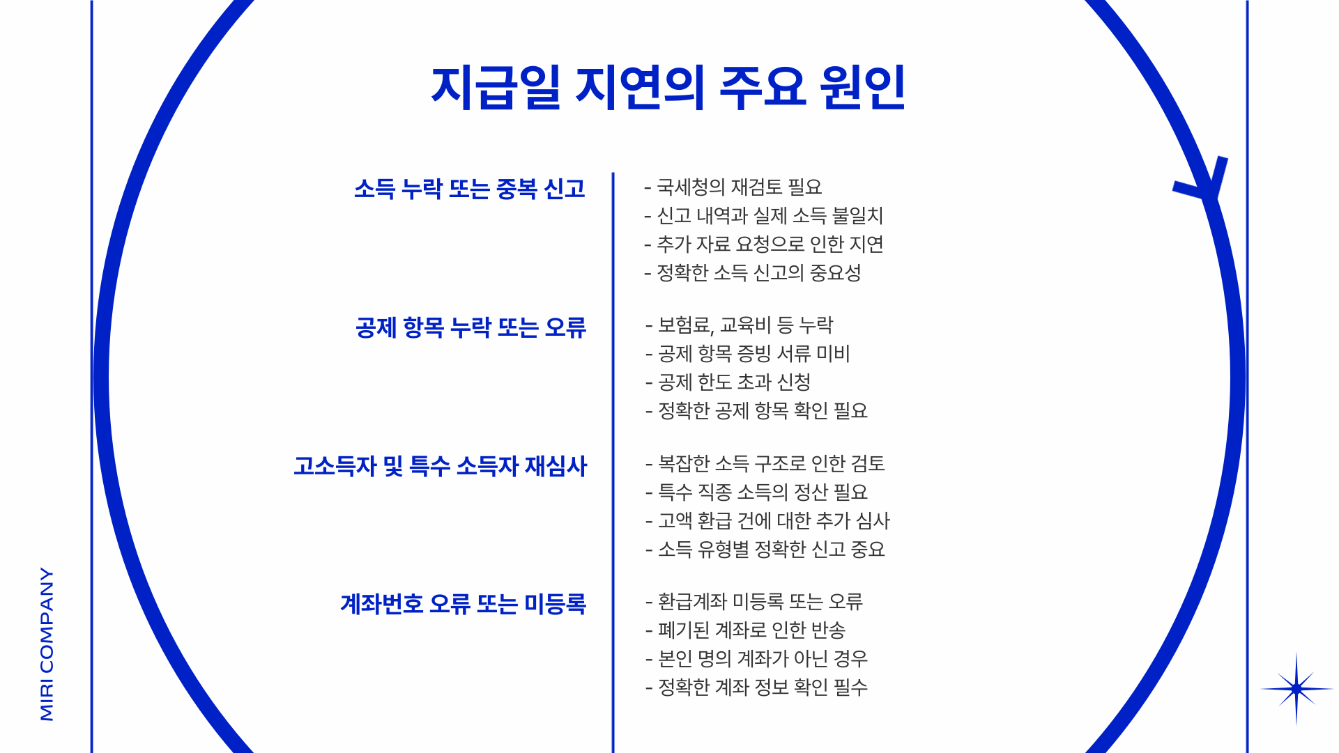 공제 내역 오류, 계좌번호 문제, 체납 상계, 고소득자 정산 등 다양한 사유로 지연될 수 있습니다.