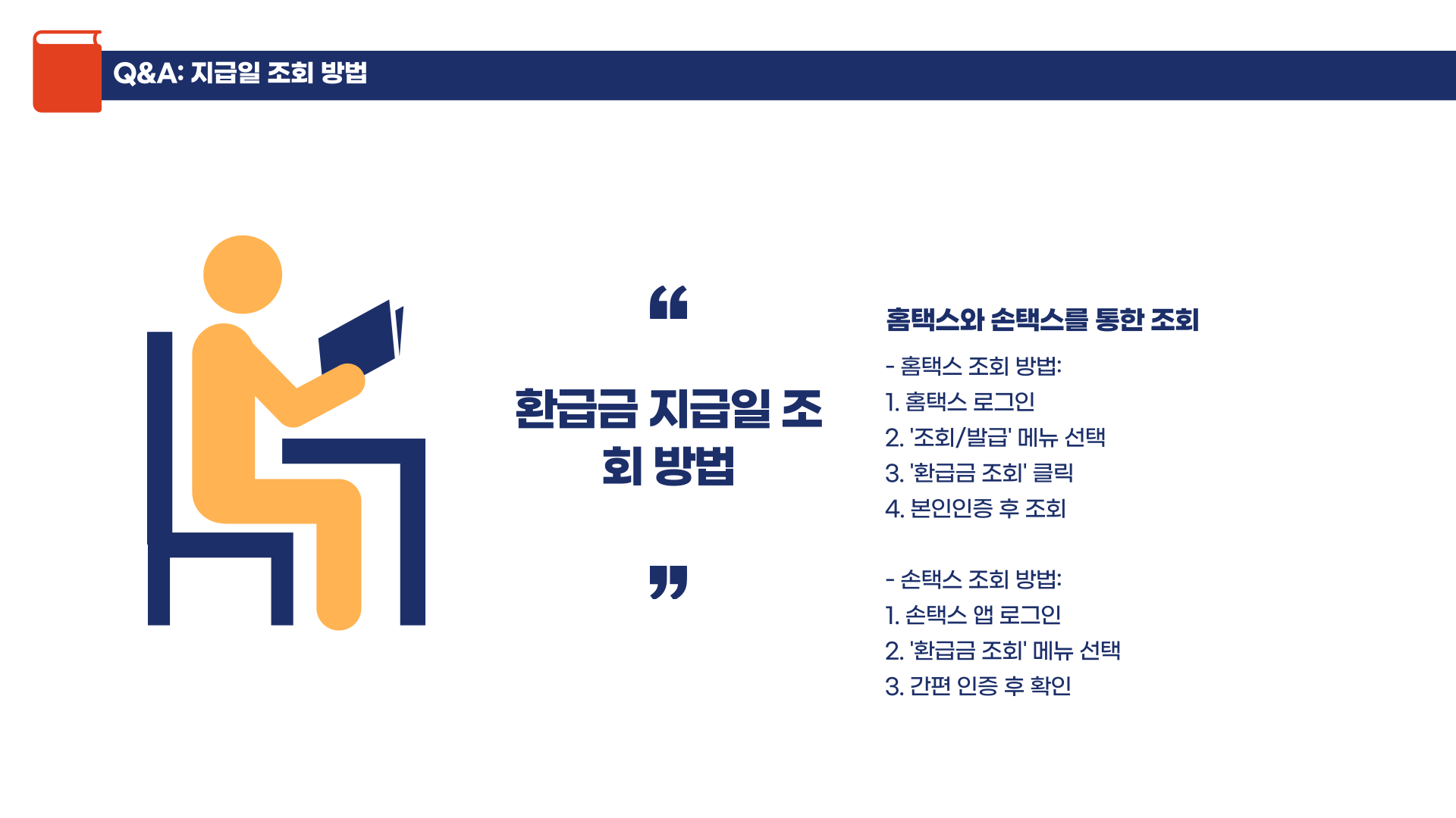 | Q. 홈택스에서는 어떻게 확인하나요? | [조회/발급] 메뉴 → 환급금 조회 클릭 후 본인인증 |