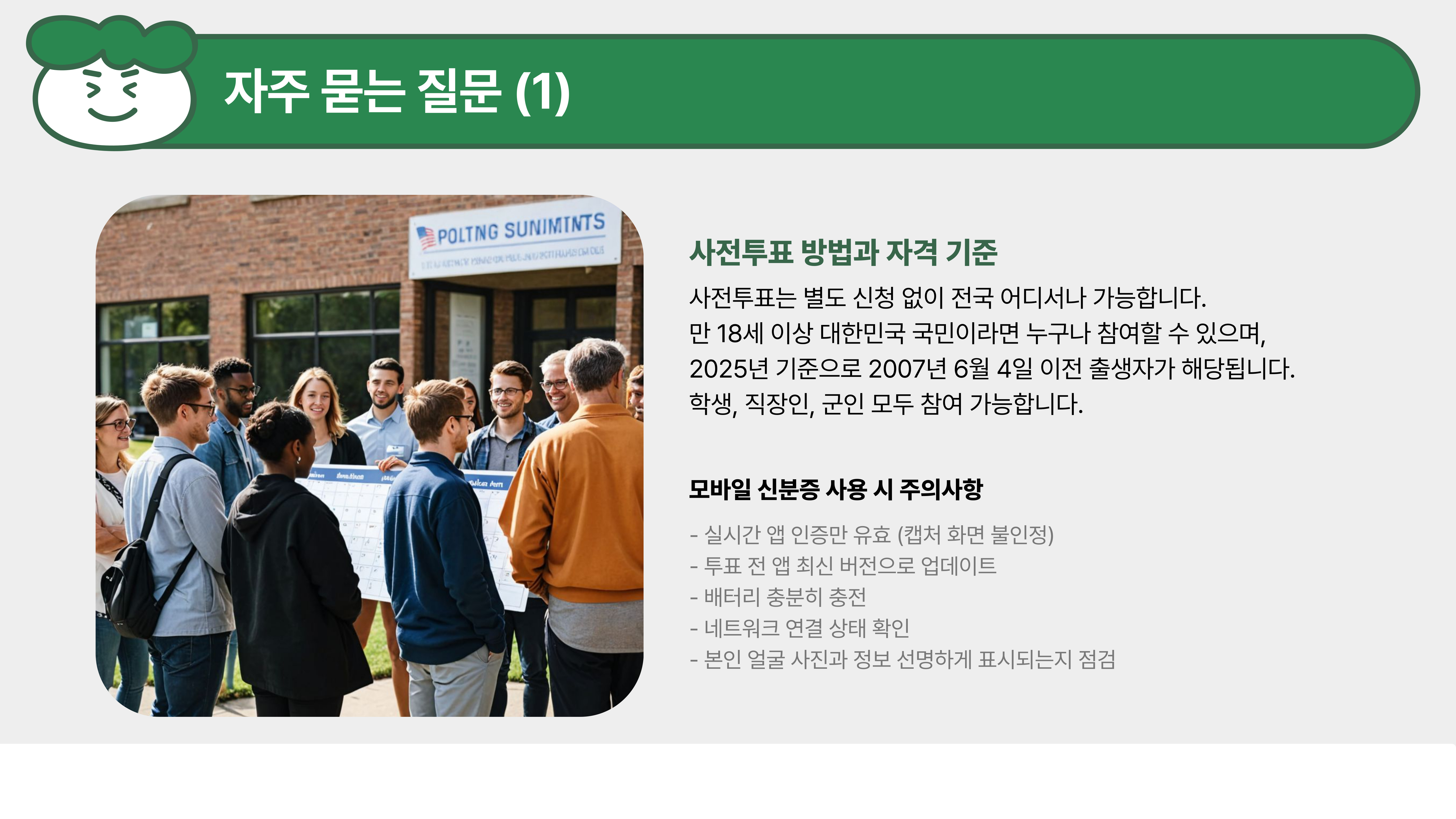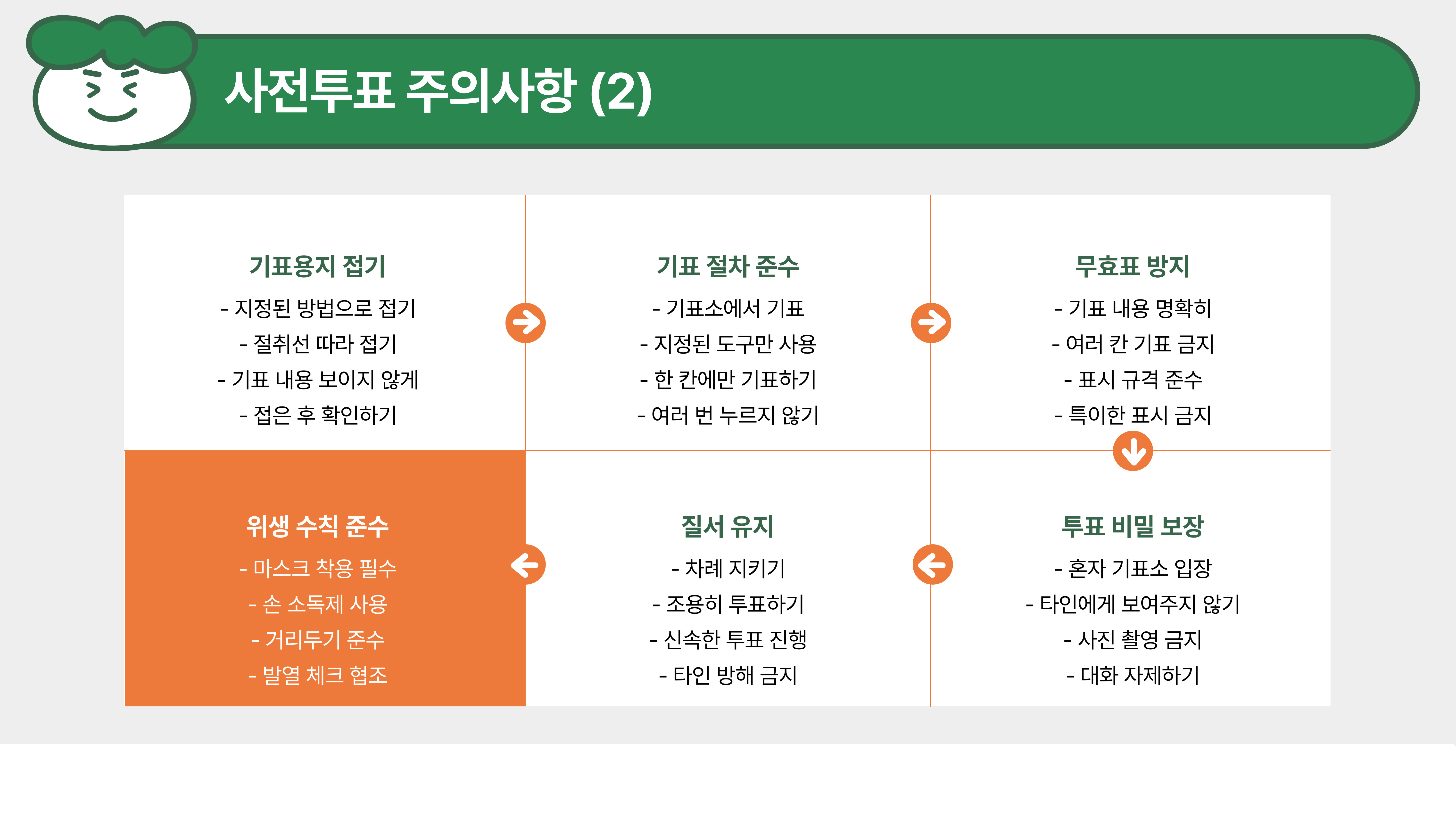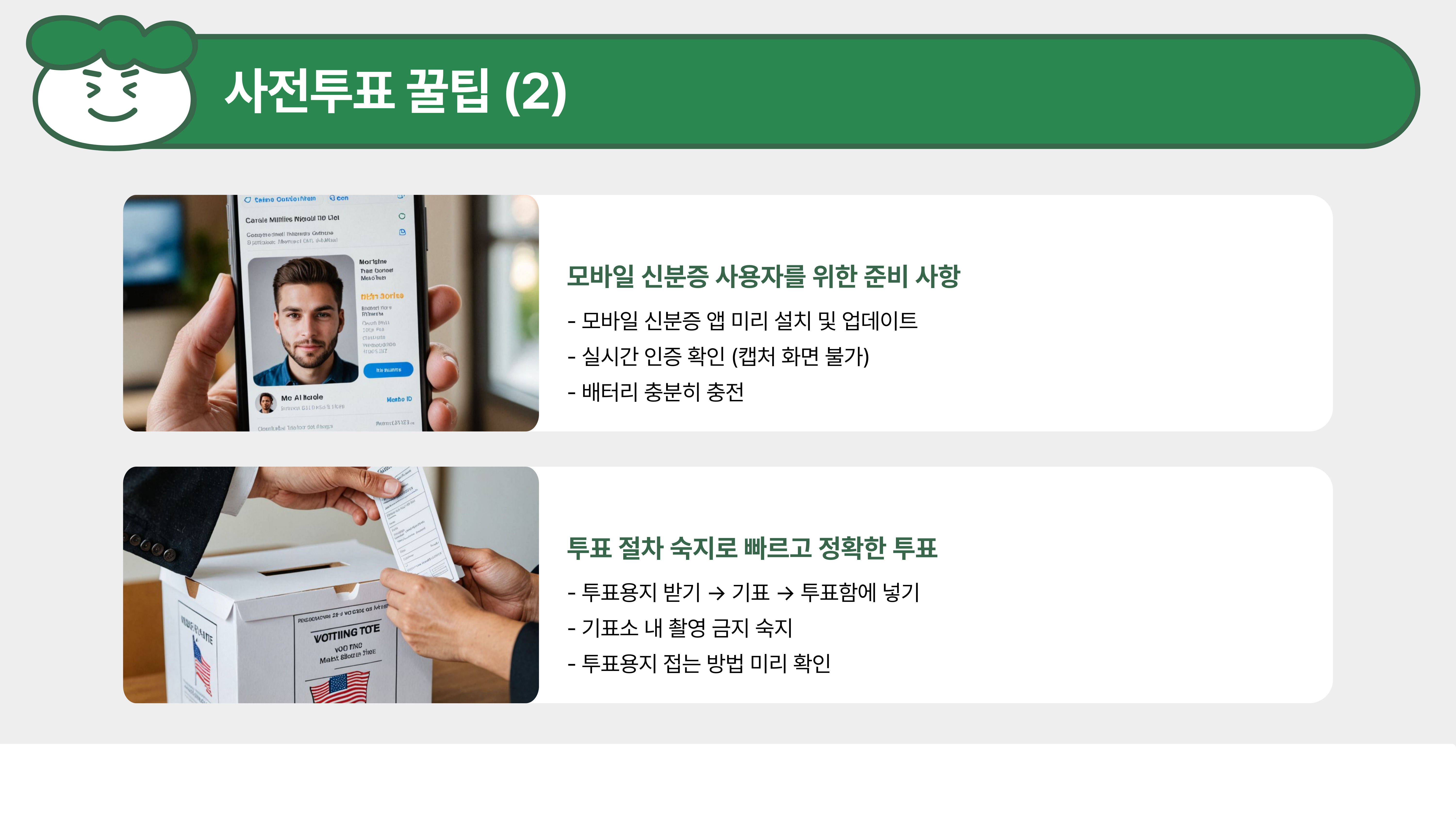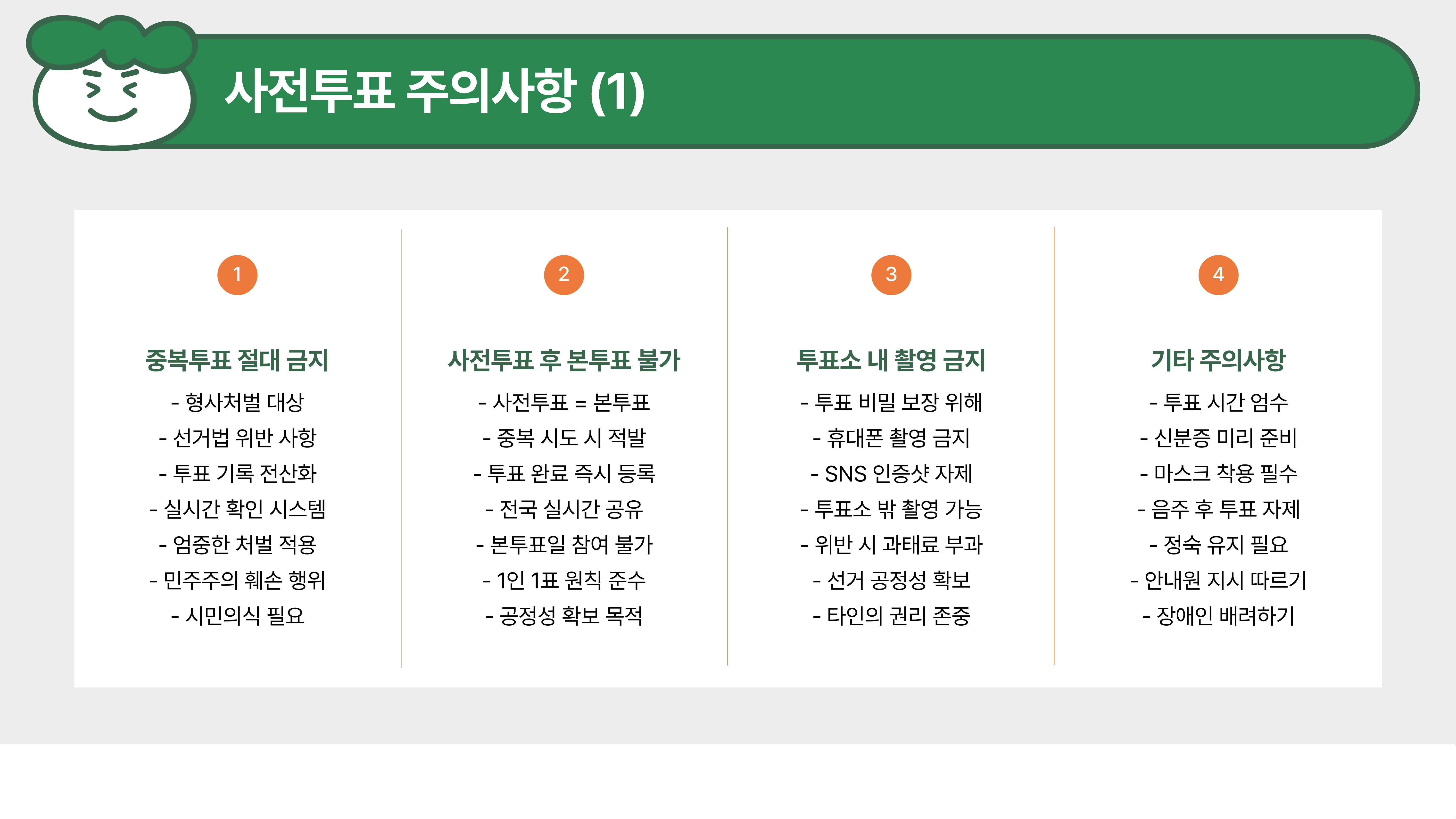 사전투표 시 몇 가지 주의해야 할 사항이 있어요. 중복투표는 절대 금지이며,
