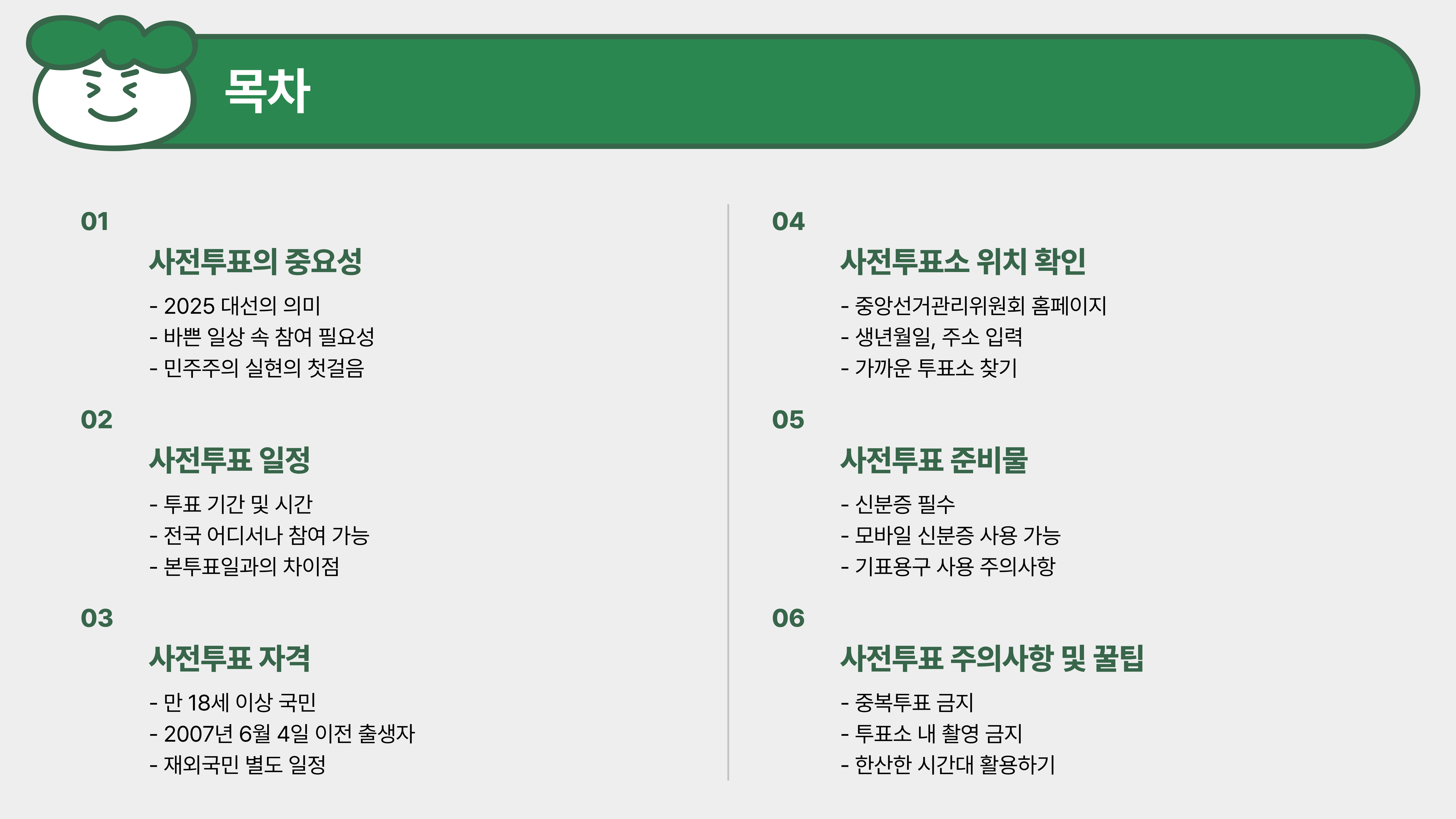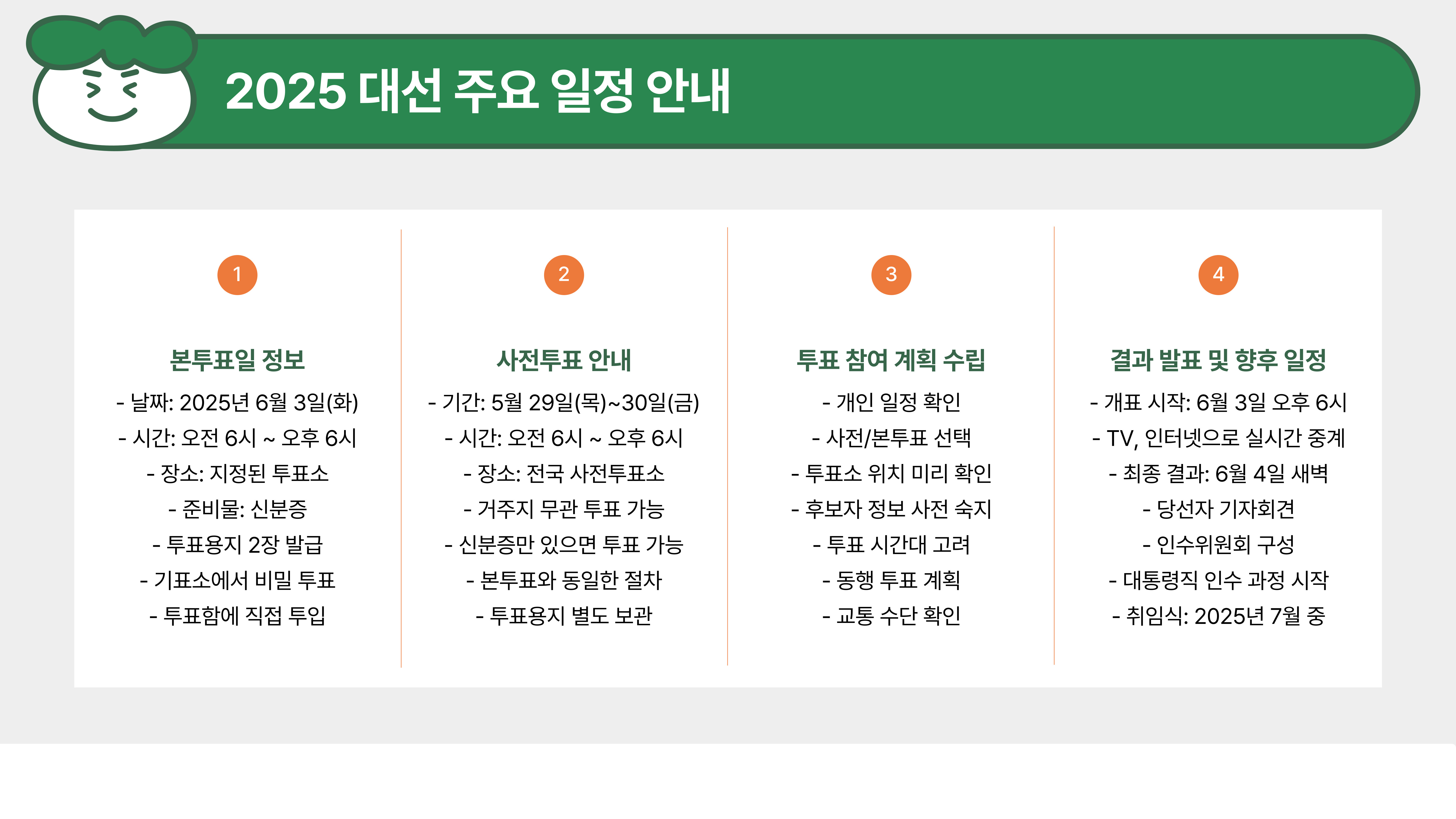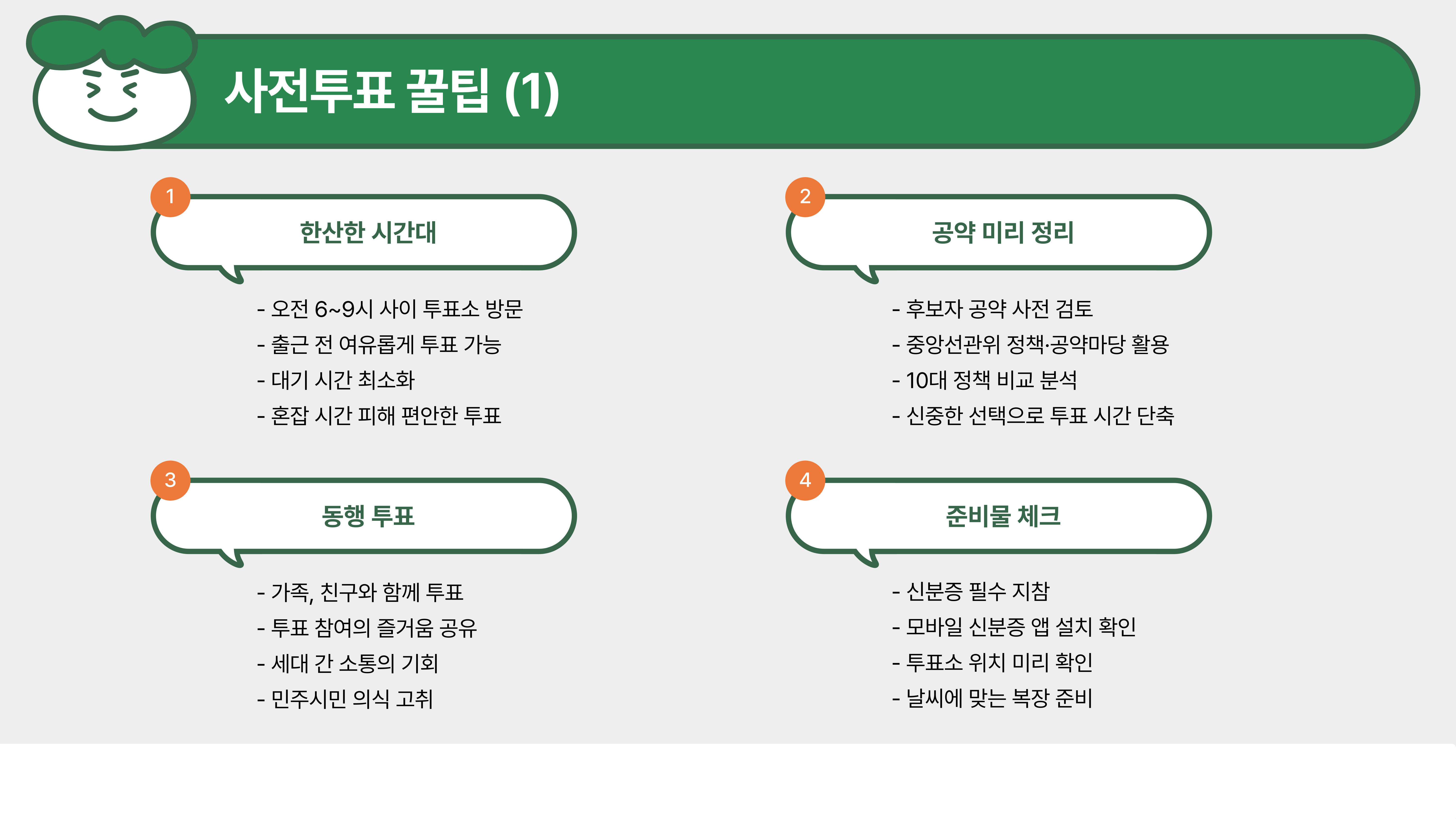 - 투표 전 후보자 공약을 정리해 두면 빠르게 선택 가능!