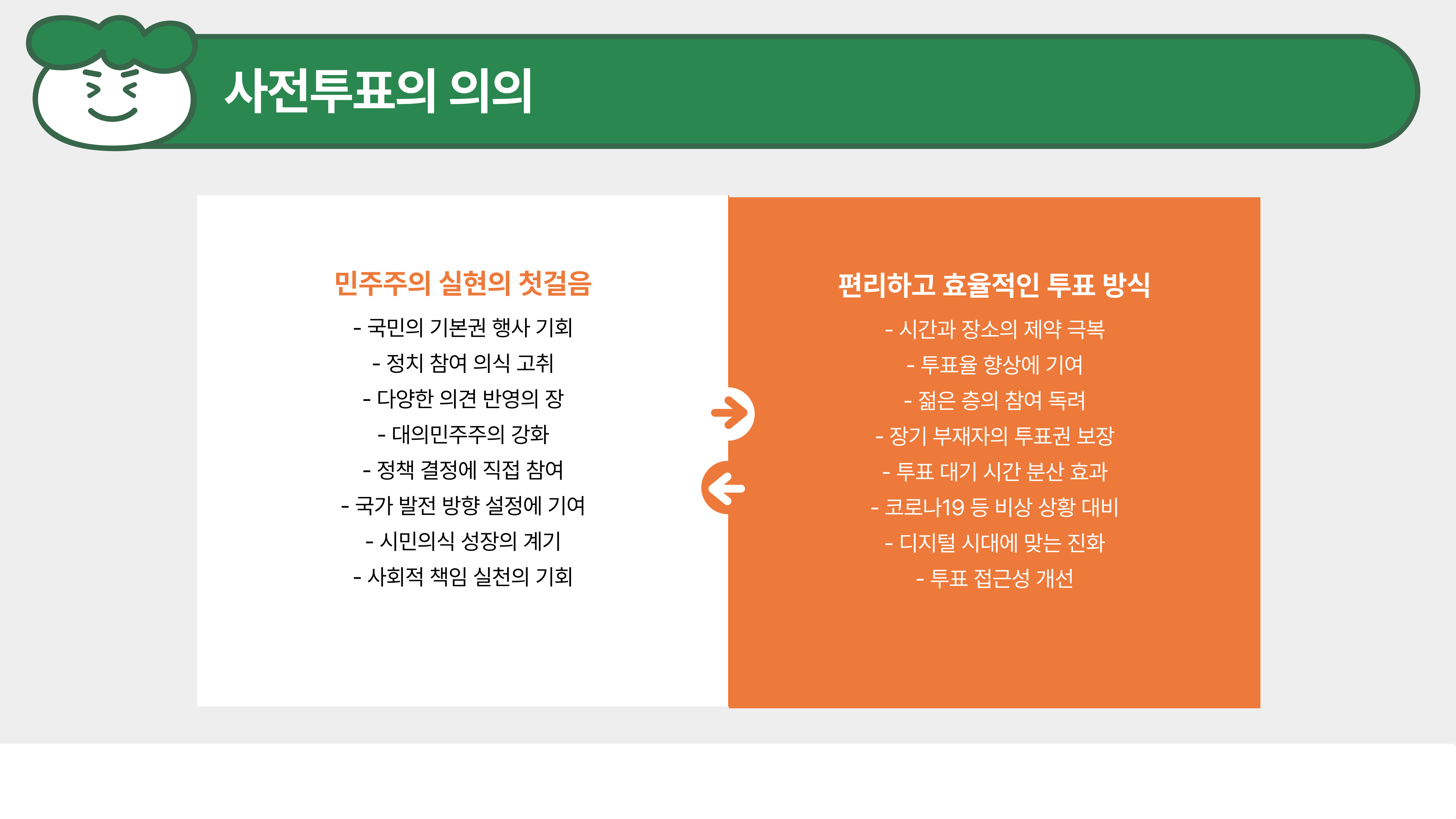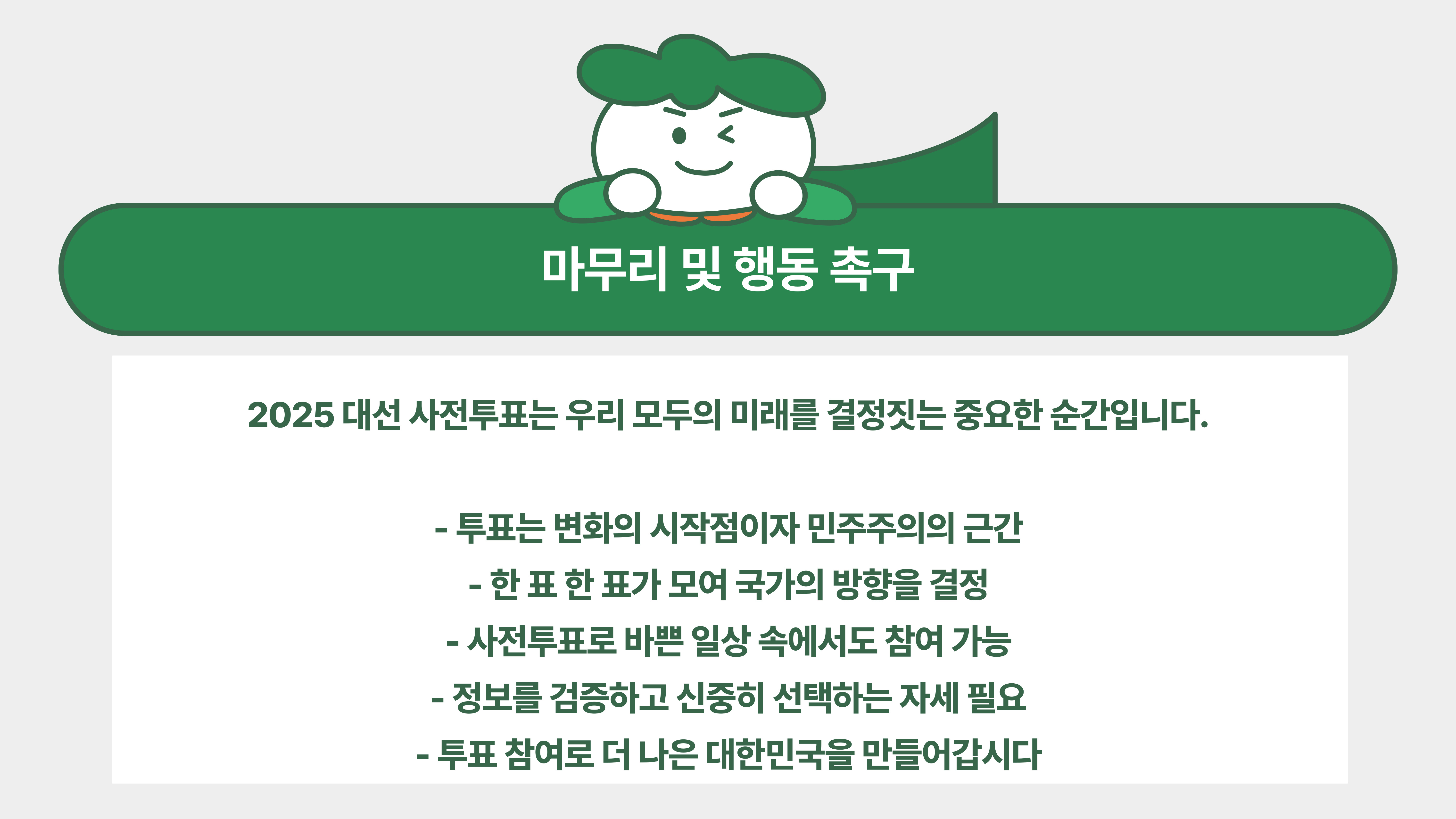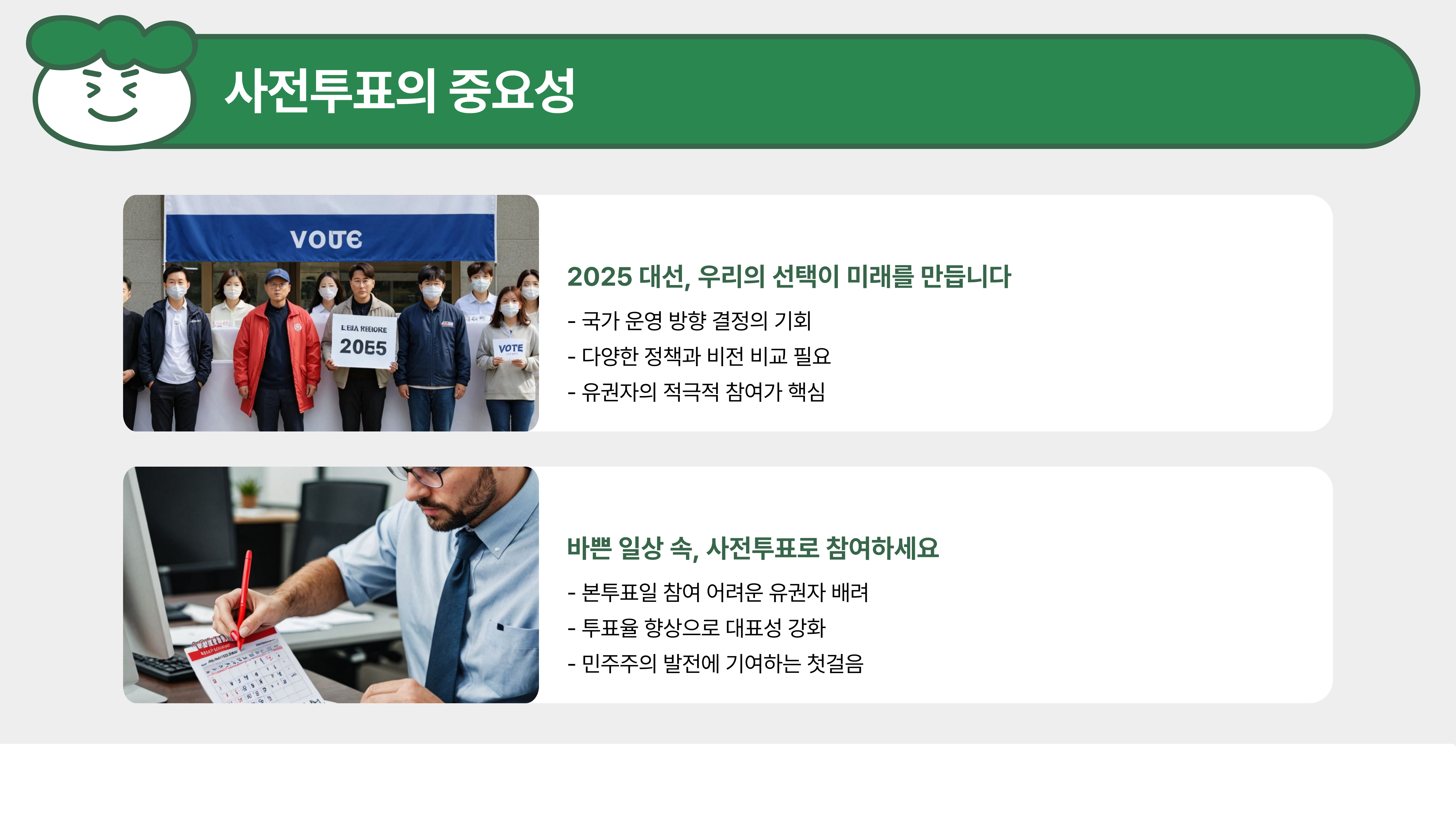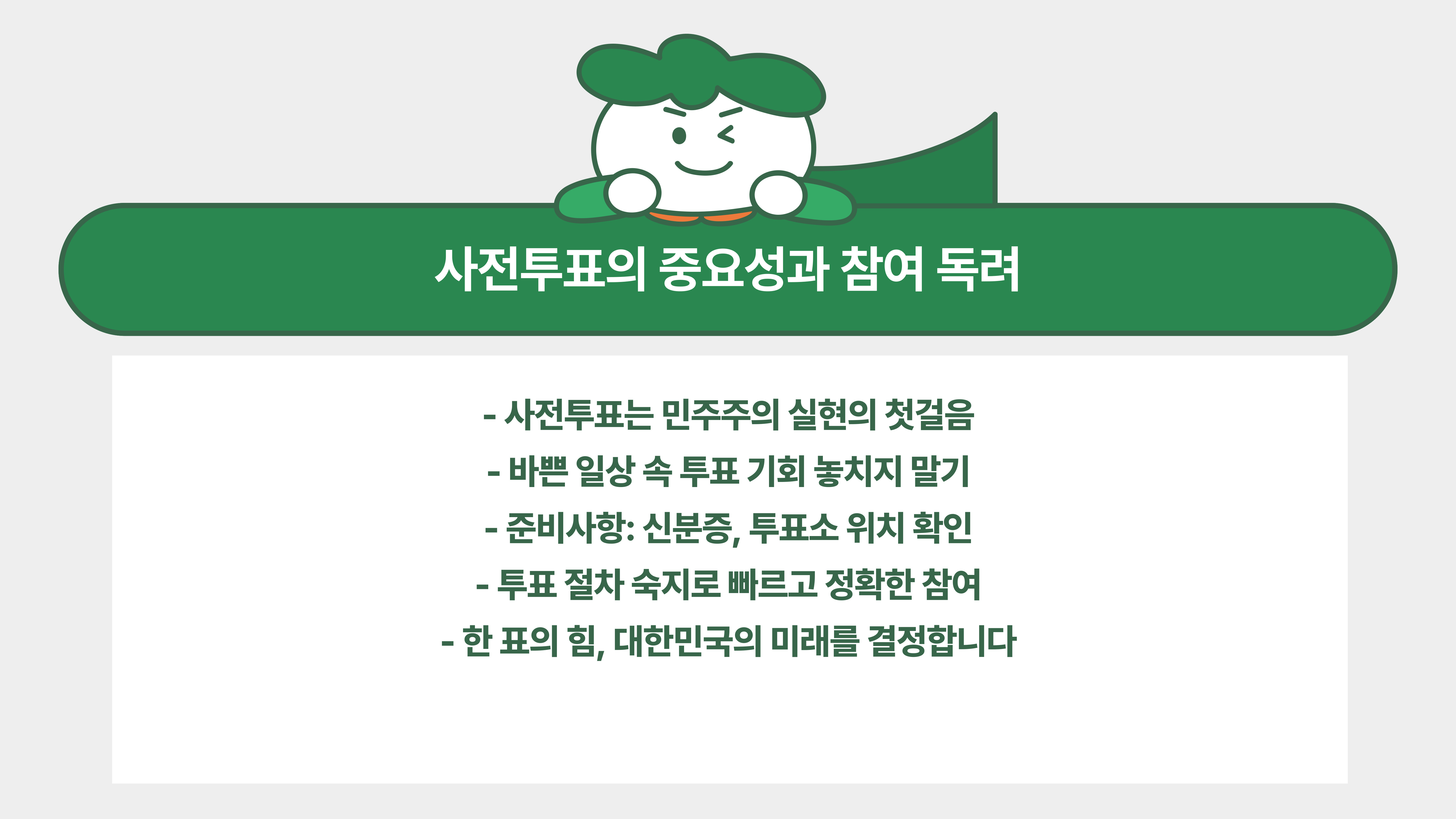 여러분, 사전투표는 우리 모두의 소중한 권리를 실현하는 첫걸음이에요.