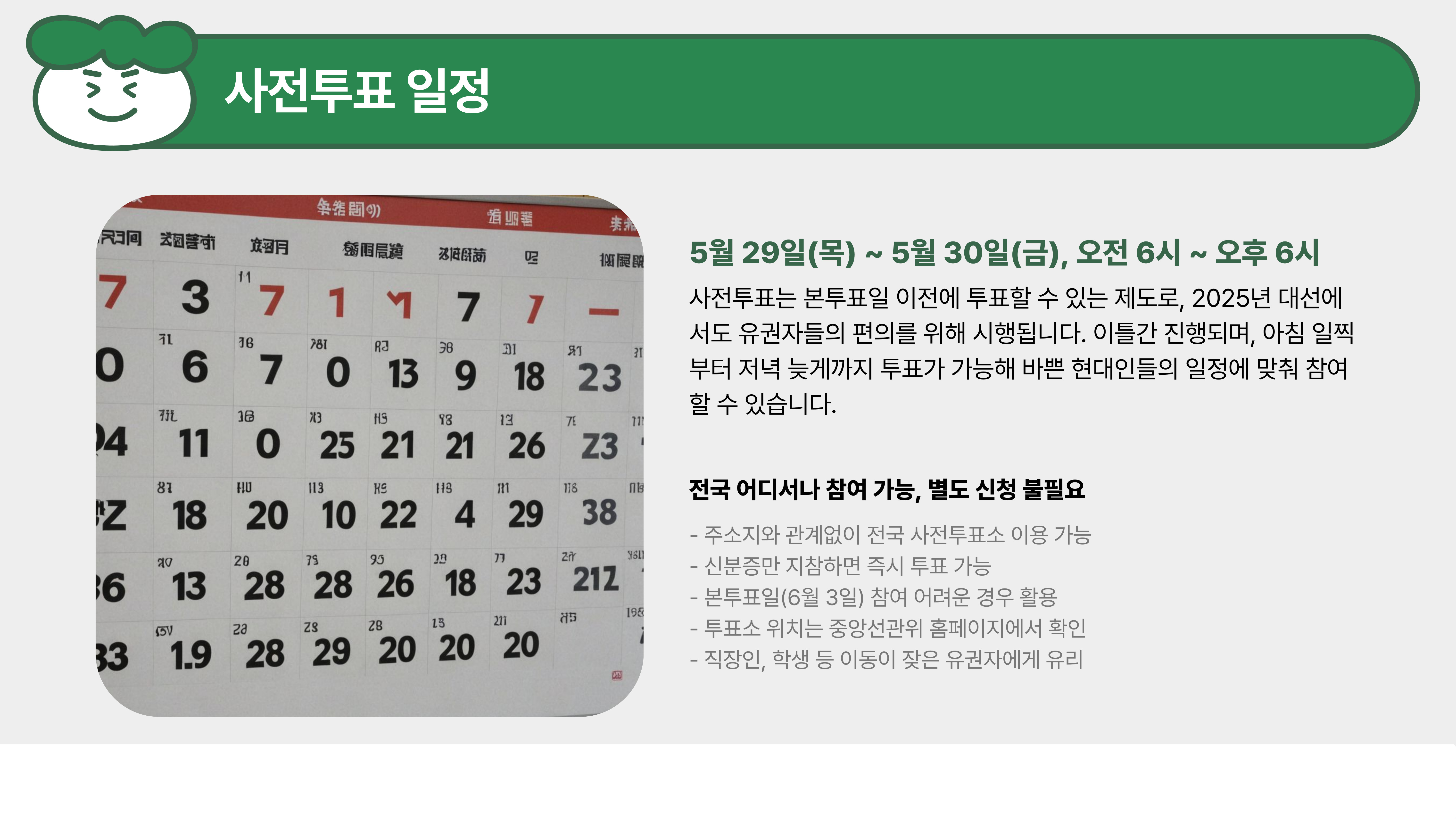 2025년 대통령 선거의 사전투표는 5월 29일 목요일부터 5월 30일 금요일까지, 단 이틀 동안만 진행됩니다.